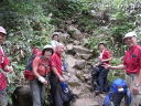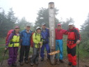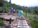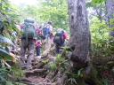 | 【山行記録】 ISさん日本百名山の百座目記念山行という特別な山行に同行させてもらった。 ここのところ連日の猛暑は各地で熱中症による犠牲が伝えられているので登山準備も頭の中は熱中症対策の事ばかりに集中して行った。しかし前日の予報では2日間共曇りで予報気温は28度程度と大幅に低下していたが連日の猛暑に信じられず対策を怠らなかった。 曇天の中、AM6時に新座を出発。所沢ICから湯沢ICまで渋滞もなく順調に走り国道17号線から和田小屋へ通じる林道に入る。和田小屋手前の駐車場にはすでに十数台の車が停まっていた。各自身支度を整え駐車場前の登山口から入ったが直ぐに車道に出て10分位歩くと和田小屋が見え、小屋前の湿地帯から登山道に入る。湿気の多い樹林帯の中ひたすら登って行くと間もなく雨が降りだしてきた。 やがて視界が開け下ノ芝休憩ポイントに到着、ここから中ノ芝、上ノ芝と休憩ポイントが続くが木道も休憩場所も真新しい木材で立派に整備されていた。 やがて小松原コースの分岐に到着。2年前はここを下山ルートに選んだが今回は昌次新道を下りる予定だ。Sさん夫妻は今日で5週連続の山行だというが全く疲れを見せず快調そのもの。驚愕の気力体力である。 他のメンバーも快調に登って神楽ヶ峰に到着。ここから200M程下ってから雷清水、お花畑と癒しのポイントを通過して最後の登り返しを踏ん張って苗場山頂上へ。 頂上標識でISさんがメンバーから祝福の握手攻め、ISさんも満面の笑顔で喜びを表していた。やはり目標を立て努力し到達した事は素晴らしい! 生憎の雨天なので散策も諦め早々に小屋に入り着替えを済ませ完登祝賀会へ。 小屋の許可を得て手製の祝横断幕を張ると福島から来た中高年グループも祝ってくれた。今回のメンバーでUSさん以外はかなりの酒豪達?止めるものもいない中、次々とビール、ワイン、焼酎と祝杯が重なって行く。泊り客も少ないのが幸い?して延々と宴は続いく。 夕食時間になってから明日の下山を考える自我に目覚め終宴となった。 2日目も昨日に続き雨天の為、リーダーの判断で下山は登ってきた祓川コースとした。 時間的ゆとりもあり遅めに出発。全員二日酔いもなく足元を慎重に運び下山した。帰路は温泉とSNさん行き付けの蕎麦屋に立ち寄り順調に帰宅できた。 SW |
