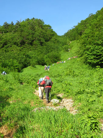 北岳に向かって、たくさんの人たちが登っています。