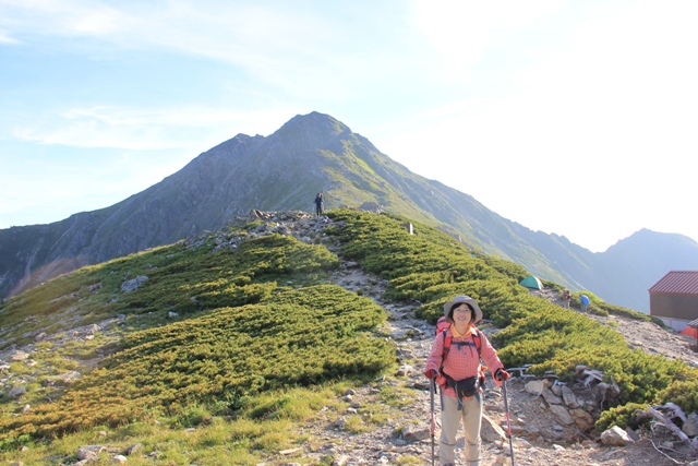 北岳山荘出発 後ろは昨日登った北岳です