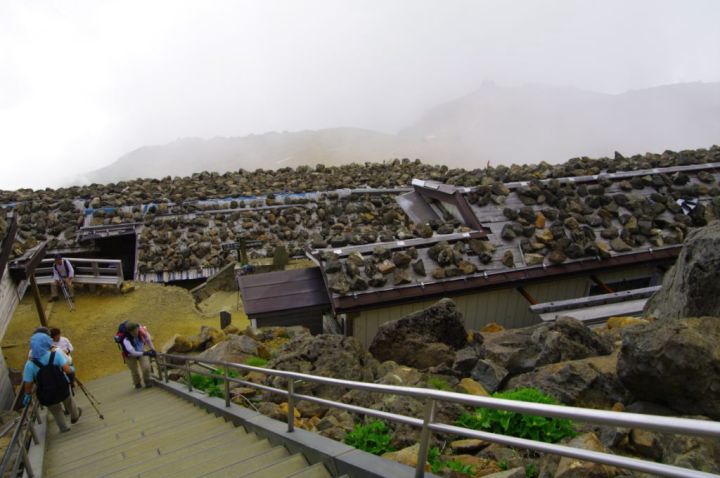 山小屋の屋根には、石が一杯おいてある。