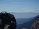 爆睡したので全員元気100倍でしたが、T・Mさんは靴底はがれのアクシデントで今日の妙高山往復登山を中止し、 ヒュッテで待つことに。 不要な装備をT・Mさんにデポして、私達3人だけで軽くなったザックで5時25分出発しました。 朝のすがすがしい空気のなかでの登山は、とても快調でした。 ザックの重量・快適な気温が、こんなに歩きに影響するものなのかと、あらためて思いました。 頂上からは 白馬連山・槍ヶ岳・富士山等のすばらしい展望、感激です。