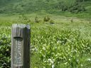 登山口の無料駐車場に車を移動し、5時25分登山開始。 私は前日の運転疲れ・飲み疲れ・寒さでの寝不足からか、どうも調子が出ず、吐き気がして胸がムカムカ二日酔い気味。 汗を大量にかいて辛抱しながら皆さんについて歩いていたら、しだいに治ってきました。 10時過ぎに高谷池ヒュッテに全員元気に到着。ここにザックを置き、水と行動食だけ持って,マップのコースタイムを信じて 火打山まで往復しましたが、タイム通りはとてもとても無理・・。 日蔭のない炎天下の道と急坂・タイムオーバーで全員ヘトヘト。いや〜この往復は本当に疲れましたね。 (途中でT・Mさんの靴底の踵のゴムがはがれ、予備の靴ひもで固定して歩くというアクシデントがありました。 登山前の靴の点検の大切さを思い知らされました。) 疲れましたが 高谷池・天狗ノ庭の湿原の美しさ、火打山頂上からの展望はとても素晴らしかったです。