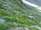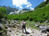 | 【コメント】 <1日目> 前夜 沢渡Pに入り翌朝5時20分のバスで 上高地に入る。 今日は 奥穂高山荘までの9時間の行程です. 気温も高く 途中 本谷橋でゆっくり休憩を取る 涸沢カールはまだ雪渓があり 涼しい。 二つの小屋で ラーメンやおでん ソフトクリームを食べ 英気を養い奥穂高山荘をめざす <2日目> 奥穂から 西穂の縦走です 一番心配していた天気は 良いので何より有りがたい 山荘前の急な鎖場から 緊張が始り 奥穂高山頂でシュリンゲを身に付け目の前に聳える ジャンダルムに 緊張は 益々高く。 馬の背を慎重に越え 小さな岩稜のアップダウンが続く。 ジャンダルムは近くに見えて 遠い。基部に荷物を置いて ジャンダルムの頂上へ 。 素晴らしい展望でした。Uさんが お祝いにみかんを出してくれた。 天狗の頭に向かって岩のコースを慎重に選び 所々 ココ上がるの?と思うような箇所は あるものの上がれないところは 無く 順調に 進む。 ジャンダルムの先を偵察に来て 奥穂に戻ろうとしていた 若い女性を仲間にして すぐ そこに見える西穂に 簡単にたどり着ける気がして緊張もどこえやら。 しかし コブ尾根の頭 畳岩尾根の頭がどこだかもわからず越え、目の前の岩を越えるこ とで 精一杯でやっと 天狗の頭に着く。 間天のコルへの下りは長い鎖場の逆層スラブを通過 浮石も多く緊張する。 間の岳山頂は、ココ?と思うくらいで 岩の一個にペンキで印されて 気つかず通りすぎて しまいそうになる。西穂が手の届く所となった。しかし 越えても越えても 緊張の岩場が 現れる 連れの若い女性もバテぎみに なってきた。 ガスが出てきた。急な岩場を登りきった所がP1の頂きで男性4人の登山者が休んでいた。 ガスの向こうに西穂の頂きが見え あと一下り 一登りで西穂に。 とうとう 西穂に到着。先ほどの4人も到着し皆で喜び合う。 喜びも束の間 ここからまだ 西穂山荘まで登ったり 下ったりで 足が悲鳴をあげている。 時間をかけて なんとか 山荘に到着。 <3日目> 天気予報で今日は雨ということで 予定の焼岳は中止し、上高地に下る。 夜に烈しい雨がふったが 朝 発つ時は止み 上高地では薄日が差していた。 バスターミナルで 山行を終えたSさんたちグループと偶然 会い 喜び合う。 その後 、またまた偶然にも、 松本の温泉で出会う。 我々は初めて行く温泉で、まさか の嬉しいビックリ! 一緒に食事をして山行の終わりを祝う。 (K.I=記) |