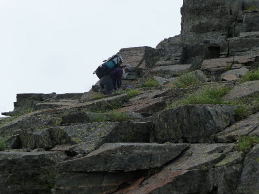 天狗岩から逆層のスラブ状の岩を長い鎖で下ります