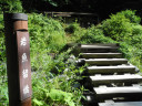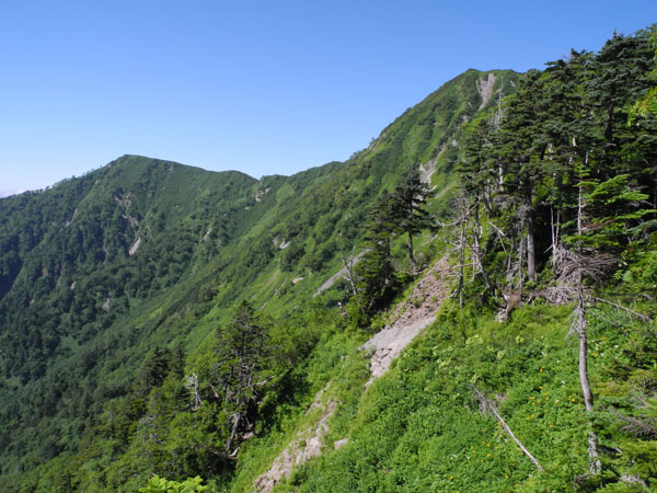 | 【記 録】 8/8(水) 新宿BTM7:30発”さわやか信州号”に乗車、ほぼ満席、旧知の”窮屈信州号”ではなく、快適。 中央高速から松本・新島々経由上高地には定刻より早目の11:55頃BTMに到着、上高地は快晴。 BTMで登山届けを提出し、身支度を整え河童橋付近まで行って木陰を選んで昼食を摂る。 1年半振りの上高地、穂高連峰をはじめ周囲の峰々の展望が素晴らしい!この時期観光客も多く賑わっている。 相変わらず美しい清流ではあるが、川原に下りてみると水の臭いに変化が、かつての清涼な薫りは何処へやら? 梓川の上流には、沢山の登山者、観光客が出入りし、夏場でもあるし、矢張り汚染は進んでいるなと感じた。 素晴らしい山々を眺めていると時間はどんどん過ぎてしまう。 12:40明神に向かう、上高地と言えども好天に日差しは強く緑陰を選んで歩く、焼岳を背に、西穂高岳を左に 眺めは心弾むプロムナード、実は今回ショルダーを新調して初めての山行、装備は12kg、背負い心地もまずまず、 明神着13:20 暫し休憩、明神岳の眺めを堪能13:35発徳本峠を目指す、 13:40奥上高地自然探勝路から別れ、徳本峠への登りに入る、白沢・黒沢沿いにほぼ真直ぐのコースをジグザグ に(3.8km)、実に41年ぶり(1971/8/15)の徳本峠小屋訪問です、途中センジュガンピ(千手岩菲)の花々や 沢音を楽しみながら15:40峠に到着、テント場と新装なった徳本峠小屋、懐かしい休館の一部が保存されている。 宿泊の手続きを済ませ荷物を預けて、17:30の夕食まで”マッタリ”ここまで来ると暑かった日差しも有り難く感じる 矢張り”ビール”です、明神岳の眺めは最高を肴に乾杯、暫しの歓談・満たされるひと時です。 8/9(木) 朝食5:30を済ませてからの出発なので、起床は5時前、食事前に展望台(小屋から45秒)へ 朝日に映える明神岳・前穂高岳・奥穂高の眺めが素晴らしい!いつまでも見飽きない光景が展開されている。 朝食を済ませ今回のメインルート霞沢岳往復の行程へ6:20、先ほどの展望台から小鳥が囀る林間の道を行く。 間もなく東方向に眺めの開けたスタジオ・ジャンクションピークを通過しジャンクションピーク(2423m)へ(7:30) ここからK1ピーク直下まではほとんど樹林の中のアップダウン、木の根を踏んで歩く道が続き、木の幹に書かれた P1〜P6のマークが案内してくれる、途中P2を過ぎた辺りでまだ新しい熊?の糞を発見・写真メモ。200m近く下って 小湿地(涸れていた)を通過しK1へは更に下っての登り返し、厳しい急登が真直ぐ伸びている、ピークと月が並んで 見えた。この時間帯丁度角度的にも登る背中を直射日光が当たり熱中症対策を怠れない、ところどころ谷筋から 流れてくる涼風が束の間の追い風となる。K1に登ってしまえば霞沢岳の頂上も遠くない100m前後の高度差は有る ものの360度の展望が疲れも遠のけてくれる。K2(2613m)を越え峰の東側から右回りに登りきると霞沢岳の頂上 (2645m)11:45、全くの素晴らしい展望が待っていました、この展望を見たさに登ってきて、天候にも恵まれて、 幸せを感じる一時、山頂で昼食、西側に伸びる登山路を見ながら5月の積雪期山の会のメンバーはこの稜線を登っ てきたんだなと思いを馳せる。贅沢な悩み上からの日差しが強すぎる、でも焼岳・西穂高岳・笠ヶ岳・奥穂高・前穂高 岳・明神岳・常念岳・蝶ヶ岳・・・・・去り難い眺めにもタイムリミットが!? 12:15下山開始、K2の付近で一人の登山者が登って行くのにすれ違った、これから? K2、K1を通過して本格的な下りへ、2箇所ほど斜面にお花畑が広がる処をすぎ、小湿地を過ぎてJPまでが長かっ た、チンタラしているうちに、先の単独行者が下ってくるのに追いつかれてしまった、声をかけると、私は台湾人です 日本語はあまり流暢ではなさそうでも、「台北登山会2010」のオレンジのTシャツを着ておられた、大滝山からきまし た、明神まで下ります。とのことだった。 ジャンクションピーク16:15 徳本峠・小屋に帰着17:10 疲れました!小屋に帰着報告と早速のビール調達で無地終了の乾杯、ゴクリ!! 後で判ったことながら、TMzさんが靴のソールに異常を感じていることもわかった、ついその前の山行でもソールに ダメージを受けての連続災難とか?!明日は自分だけ上高地に下ると言い出した。 8/10(金) 持ち合わせの針金で応急措置を施したものの、島々谷を下るには不安。KWさんも夕べヨクヨク考えたが、島々谷 を諦めて皆で上高地に下ろうとの提案、自分が同行して二手に分かれて下山するか?こような場合CLを引き受けて 本来の計画を放棄するのは・・・・と気持ちが揺れる。結局徳本峠小屋の主人に今の島々谷の状況のアドバイスを受 けて自分とTKさんは島々谷へ、TMzさんとKWさんに上高地経由をとってもらって、新島々のバス停で落ち合う事を約 束して下山へ。 6:30テント場からの明神の眺め、徳本峠小屋とも別れ、大きな岳樺の木の下をまずは、岩魚止め小屋を目指す、 稲妻方の道が続く、その昔、釜トンネルが出来る前は上高地に入る道は、岐阜県川