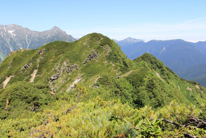 登ってきた道を振り返る、穂高の峰が・・・・・!