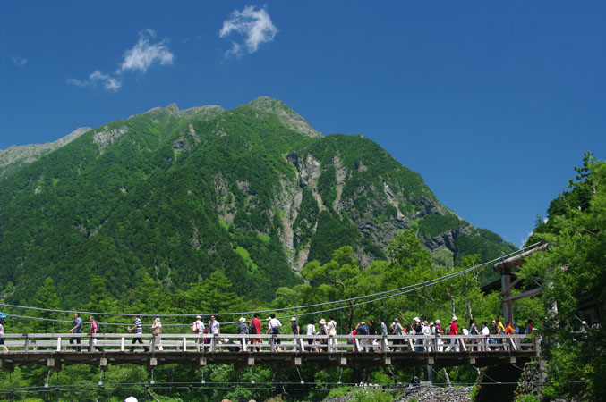 登山者・観光客出に賑わう河童橋と明神岳(2931m)