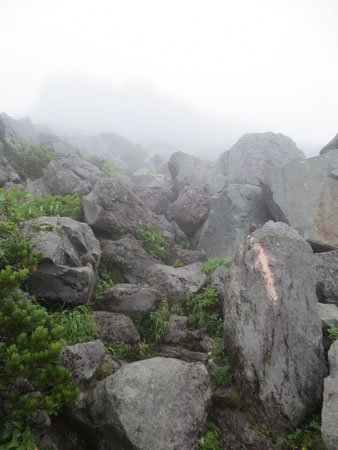 急な岩場を登ります。