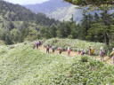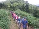| 【コメント】 7月の会山行が悪天候のため中止となりおよそ2ヶ月ぶりの会山行となった今回、場所は群馬県吾妻郡六合村(くにむら:現同郡中之条町)にある野反湖を眼下に望む三壁山、高沢山、エビ山である。 新座駅を6時ちょうどに出発。高速道路は渋滞もなく予定より20分早く野反湖畔駐車場に到着(9:20)。 まだ9時少し回ったばかりだというのに、朝から真夏の太陽がギンギンに照りつけてきている。Sリーダーが地図、コンパスの使い方を丁寧に説明し終えた後9時50分出発。 背中に灼熱の太陽を浴びながら、登山口からいきなり急な登りを登り始める。風があまりなく登りにはかなりハードである。SLのYさんが先頭に立ちゆっくりとリードしてくれたため、ばてずに三壁山(1974m)山頂までなんとか登りきった。途中、熊笹の間から野反湖が蒼く透き通って見えた。一服の清涼剤である。この辺まで来ると、時折、山岳特有の澄み切った爽やかな風が我々を元気づけてくれた。山頂は案内板があるだけで展望はなかったが、付近の涼しい場所で昼食休憩。(11:30)これが大正解! 後でわかったのだが、昼食後、大高山分岐を経てカモシカ平まで足を伸ばしたが、此処はなだらかな盆地状の笹原が広がっており遮蔽物がなく日差しをまともに浴びることになった。ここで食事を予定していたのでリーダーの適切な判断で食事もおいしくゆっくりと摂れたのである。感謝! カモシカ平から分岐に戻るまでの150mほどの登りは、またまた背中に灼熱の太陽を浴びることとなり、汗だくになりながら登ったので水がやたらとおいしかった。 カモシカ平はキスゲの群生地だそうだが、我々が行ったときはもう咲き終わった後でした。湧水池が近くにあったが時間の関係で行けず残念でした。たぶん美味しい冷たい水が飲めたはずである。 分岐からは高沢山頂はすぐに到達。ここも周りの景色が何も見えず山頂らしからぬ場所でした。小休止の後エビ山に向かうが、ここからはしばらく下った後、登り返しがありおよそ40分ほどでエビ山(1744m)山頂に到達。山頂からは今登って来た高沢山・三壁山の稜線が見えました。日差しを避け芝草が生えている日陰で暫しの休息、休息場所がよかったのか暑さのためか「もう動きたくないなあ᠁」と誰かがひとり言を漏らす。エビ山を2時30分に出発、途中、野反湖を左に眺め遠くに八間山を見ながら弁天山を経て野反峠まで1時間30分の行程で予定通り16時ちょうどに駐車場に到着(歩程約5時間)。 帰りは道の駅「六合」くつろぎの湯に入って疲れを癒し冷たいビールで乾杯! Sリーダー、Yサブリーダー、皆様お疲れ様でした。 記:K/U |
