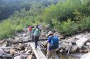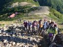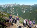 | 朝食を済ませ、定刻に蝶ヶ岳ヒュッテに別れを告げ、コースごとに下山、温泉を目指す。 悪路が続くが、今日は下山だけなので大丈夫。足を気にしていたTさんも大丈夫そう。私の前の前を歩いていたIさん。お話しするととても面白い。見た感じとは違って・・(笑) | |