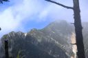 | すこしすると樹林帯。展望が悪いのは仕方ない。 やがて、蝶槍。ヤッホー休憩を取る。 このヤッホー休憩はUさんが命名。 Uさんに怒られるのでみんな、言われたように、ヤッホー!ハイジ!ペーター!クララ!と叫ぶ。かわいそうなのは(笑)蝶槍の上いたお兄さん。 そこにいたのでクララ!の次に「おじいさーん」と叫ぶ羽目に。でも、こころよく(多分)叫んでくれた。そして、写真まで撮ってくれた。私好みのお兄さんだったな(笑) | |