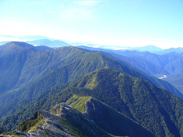 常念岳から蝶ヶ岳の小屋が見えました