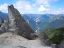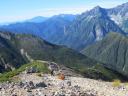 | 山頂からは浮石のある急な下りで、いくつかのピークを越えていく。振り返ってみる常念岳は大きくて立派である。 | |