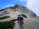 | 常念小屋までゆるやかな下りで、槍、穂高の稜線の景色を楽しみながらハイマツの中を進むと、正面には常念岳が大きく高く見える。常念小屋から山頂までは1時間ほどの岩だらけの道をひたすら登る。 | |