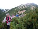 | 前夜、中房温泉に泊まったKさん、Sさんが睡眠十分という顔で合流し、10人で出発。 北アルプス3大急登の一つといわれている合戦尾根を登る。 | |