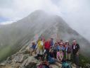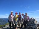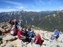 | 小屋から急坂を登り、合戦沢の頭に出ると燕岳、大天井岳、そして槍の穂先も頭を出しているというすばらしい景色だ。ほぼ予定通りの行動なので、全員揃って花崗岩のきれいな燕岳山頂を踏む。 | |