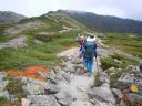 | 昼食を取り、大天井岳へ向う。あまり登り下りのない道を進み、蛙岩を過ぎた辺りから大下りとなり、この登り返しが結構きつい。やがて槍への分岐に着き、ここから大天井岳を左に巻いて大天荘に到着。 | |