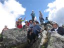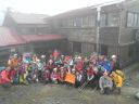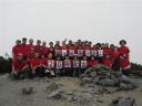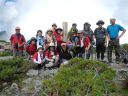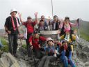 | 7時15分徳澤園を出発、30分毎に休憩を取りながらゆっくり長塀尾根を登り、11時10分長塀山山頂に到着。予定より早い12時40分蝶ヶ岳山頂に到着。蝶ヶ岳ヒュッテにザックを置き蝶槍まで往復1時間散策。ヒュッテに戻り他のコースの到着を次々に出迎え、涙ぐむ人、抱きつく人、握手に拍手、皆、素晴らしい笑顔です。41名全員集合する事が出来て感動の連続です。記念写真の撮影後乾杯! |