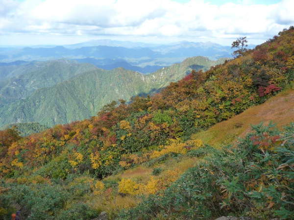 紅葉の向こうには越後駒ケ岳からの郡界尾根が見えます
