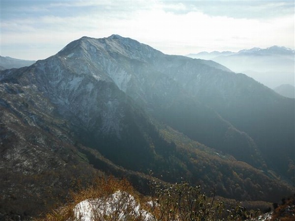 雨飾山(1963m)、右奥は北アルプス