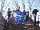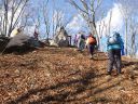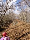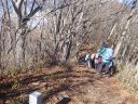 | 尾根は植林帯を抜けると明るい落葉した稜線に出て、右手に川苔山、左手に鷹ノ巣山などが見えてきます。北へ向かう一本道で明瞭な分岐なども無く、テープも木に付けられていて、(中には作業用らしいものもありますが)迷うことなく、笙ノ岩山に到着しました。 |