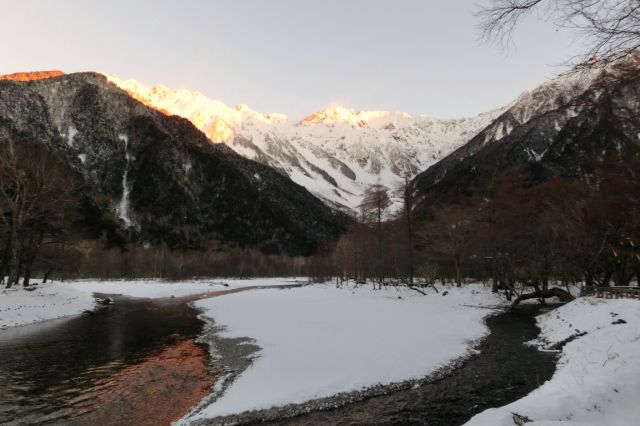 朝の梓川と穂高連峰