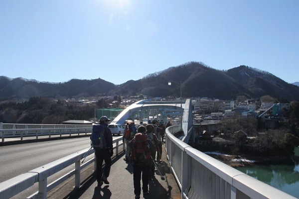 前方に金剛山〜宝山の稜線を見ながら日連大橋を行く