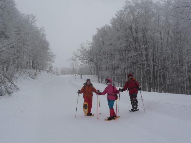 クロカン用に圧雪された道をスノーシューで歩きます