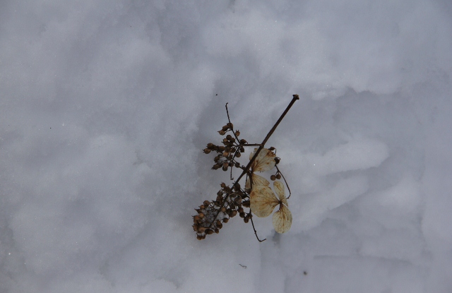 雪の上に花殻、何の花かしら・・・ きれい!