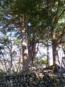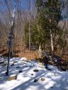 | 倉沢の檜は立派な石垣で囲まれ、これまた立派な説明板が立てられている。この檜は都内で最大、都の天然記念物だと分った。奥多摩は江戸時代から森林を保護されているので、巨木が至るところにある。年をとったら巨木めぐりの良いなと思う。とはいえ、南向き斜面のせいか雪の気配が全く無いので休憩しながらスノースパッツ、オーバーヤッケなどを脱ぎ、額の汗を拭った。 |