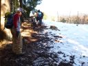 | 滝入ノ峰を出発して雪と落葉で斑になった尾根を下る。カロー谷側の木立の向こう遠くには白い奥多摩主稜が聳えていた。コルから小ピークに登り返し、また下る。SOさんが筋攣りを起こしたが無事回復し、標高点1184mを通過して雪原に着いた。平坦な 尾根筋から先行者の足跡は左に登山道へ向かっていた。その昔、初夏には尾根筋をそのまま真っ直ぐ下った気がするが踏み跡の通り、登山道へ下り、横すず縦走路に出た |