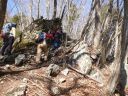 | 急上昇する狭い尾根筋を塞ぐようにそこそこ大きな岩があった。踏み跡も岩の左右を回り、なにも岩登りしないで大岩を越すことができた。帰宅後GPSトラックログで照合したところ等高線960mの地点であった。現在地確認には大変役立つと思う。適当に息継ぎ休みや昼食休憩を取りながら滑り易い落葉を踏み締め、小木や根を掴んで急登して行く。ミズナラの林には初秋に熊が作った熊棚の残骸らしい枯れ葉が着いた枝がミズナラの幹高く、あるいはその根の周りに落ちていた。この標高になっても積雪がない。ザックにぶら下げた12本歯のアイゼンの重さが羨ましかった。左の支尾根とその西の トボウ尾根と岩松尾根が合流してようやく緩やかな広い尾根筋に乗ることができた。 |