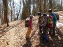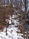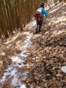 | 落葉が積もった倉沢沿いの道を見下ろし、倉沢の檜の裏から尾根筋を登る。杉・檜の人工林から広葉樹林に代わり、「これぞ、読図、日向ぼっこに最適の山筋」と心も明るくなった。葉が落ちて青空しかないミズナラ、ブナの尾根筋を登る。気持ちは良いが、急傾斜の上、落ち葉が積もって靴が滑り、なかなかの気が抜けない登りだ。急斜面から緩面斜面に代わって、目の前にNHKTVアンテナが設置されていた。日原の人々のTVデジタル化対応なのだろうか?民放はどんな設備かなと思う。が、急な尾根が続き、目の前のどの木、どの石を掴もうかとコース選びしか考えなくなった。樅の大木が混じった人工林が再び現れたが、標高800mでも積雪が全くない。雪山入門訓練との想定がどんどん失われてゆく。 |