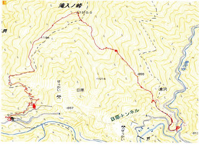 | バリエーションコースであるが踏み跡も目印テープもふんだんにあるので読図に頼らずとも岩松尾根も滝入ノ峰も少し山慣れした方なら踏破することができると思う。 読図が必要で慎重に行動しなければならないのは岩松尾根とトボウ尾根とが分れる平坦で広い尾根を下りにとったときであろう。この広い尾根ではコンパスを使い、岩松尾根を見つければ道迷いのリスクはない |