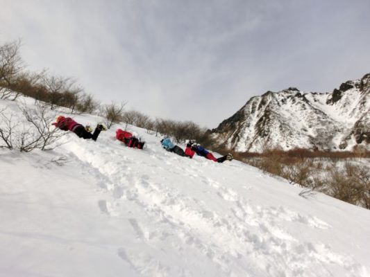 身体を反転させ雪面にピッケルを打ち込む