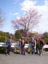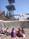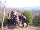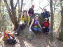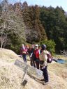 | 寒戻りの北強風という天気予報にもかかわらず、物見山のほうから山ガールのグループ、途中の茶店の中では昼食の人たち、東屋には男性グループがコッフェル・ガスストーブで昼食調理中とハイカーが多い。我々も公衆便所を利用させていただいて高指山に向かった。北風が強く、東屋からはポリ袋、我々のメンバーからは地形図が舞い上がり、蝋梅の木の下の畑まで飛ばされた。地形図を無事回収して高指山のアンテナ下に向かう |