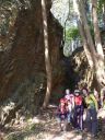 | 古滝入口から急な斜面を下って、古滝に寄り道をした。古滝(コタキ)ではなく涸滝ではと思わせるような水無しの崖であった。崖についた黒いしみからみると大雨が降った時に滝の姿が現れるのだろう |