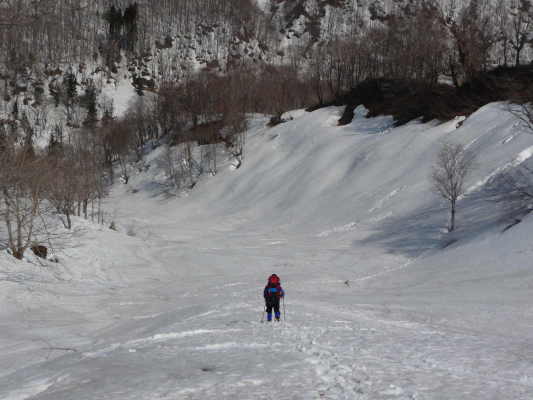 テントを撤収し、スノーシェッド目指して沢を下ります