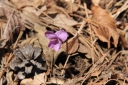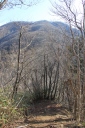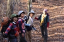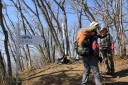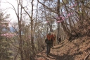 を抱えての参加だった。 落ち葉の積もった急な道は歩きにくく、日差しは暖かかったが、風は冷たいなぁと思っていた のもつかの間、じきに汗ばんできた。 尾根上に出ると、背には富士山、左手には南アルプス、前方には八ヶ岳と見渡せ、気持ちがい い ! 笹子雁ヶ腹摺山山頂でも展望を楽しみ、米沢山へ。 ここから東へお坊山へ向かうはずが北に下ってしまい、余りに急な荒れた道だとリーダーが気 付き、登り返す。一時間のロスだったが、米沢山へ戻ると立派な標識があり ?そう言えば、標 識の前で昼食をとっていたパーティーがあったと思い出したが、やはり自分達で確認しなかっ たのが悪かったと反省する。 お坊山〜大鹿峠へも急な登りと下りを繰り返し、景徳院への下りで思いがけずミツバツツジが あちこちに咲いていて目を楽しませてくれた。 ( N.M;記 )
