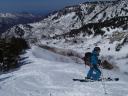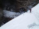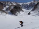 この時期、余りに良い雪なので尾根のルートから沢にルートを求め滑り込んでいき、