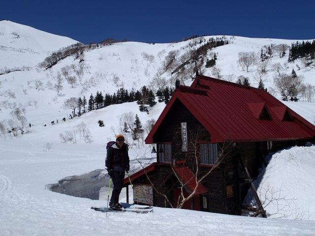 栂池ヒュッテ(昭和8年建設)前で