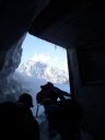 | 登山者用出口は半分開いていたが、外に身長を越える新雪が吹き溜まっていた。見ると新しい足跡がその上にあって、雪山から人声がしている。足跡の先の吹き溜まりに軽装の2人連れ男性が立っていた。目の前の黒部峡谷は白く、日電歩道は新雪に埋まって斜面と化している。「目の前の急斜面をダム下まで下るほかない」とCLが2人連れと声を掛け合っていた。2人連れは渓流釣りに来たとのことであった。 |