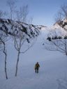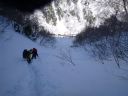 | 狭い谷の上、先行者のトレースが続いているので余計な偵察をしなくて済む。しかし所々にある数mの段差を登るのがとても苦しい。CLに置いて行かれる。間に残る数十歩の足跡が恨めしかった。 |