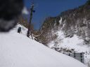 | 標高1360m辺りで、内蔵助平から下ってきたスキー・ボード3人組に出合った。お互いに吃驚したが、直ぐ、雪の状態を聞いた。「04/27は強風・風雪で外に出られず、立山の雷鳥荘に宿泊。17:00頃に雲がようやく切れた。今朝、登って(雄山?真砂岳?、内蔵助カール?)、滑り下って来た。爽快な積雪だった。黒部ダムまで下る」とのことだった。 |