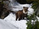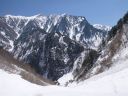 | 谷は狭く、所々に深い雪穴が開いて底には水が走っている。黒部別山の南峰の尾根が下って左岸に、左岸の上流には平坦な内蔵助平、その先には立山の真砂岳がある。雪の上にはスキーのスプールの他に真新しいカモシカや兎の足跡が乱れていた。誰かに見られているような気配を感じて右手のオオシラビソの薮に目を走らせると、ほんの2m位先に小柄なカモシカがうずくまっている。脅かさないように前を通って振り返るとまだこちらを見続けていた。 |