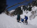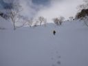 | ピッケルを差し込んで新雪が深く積もった斜面を下る。2人連れは長靴にストックで幾分ジグザグに急降下して行く。新雪は膝まである。ワカンを持ってきていればよかったのにと臍を噛む。2/3ほど下ったところで谷から登って来た単独行の男性登山者に出合った。 |