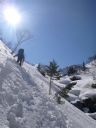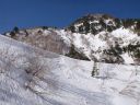 | 谷が再び狭くなり、スプールは谷底から急斜面を夏道近くまで巻きながら登っていた。谷底は雪解け水のために雪が割れ歩けそうにない。軟雪の急斜面をイヤイヤ巻きながら狭い谷筋に従って北から西へ曲がった。下山時には滑落あるいは雪崩を引き起こさないように注意が必要な場所だ。 |