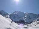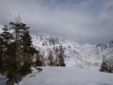| 扇沢に近づくにつれ、白い雪化粧が尾根筋、次は山肌、すぐに道路脇の平地や見下ろす谷にも広がってきた。運転手の説明では扇沢に新雪が25cmは積もったということだ。 |