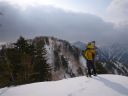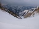 | 内蔵助谷が南東にクランクする要注意箇所で無雪期コースから谷底に巻き気味に下る。軟雪を踏み崩さないように、出ている薮にクランポンを引っ掛けないようにしながらどうにか急斜面を通り過ぎることができた。一安心。 |