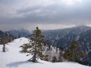| 水場になりそうな雪穴を探しながらスプールを辿った。夏に通ったあの橋はどこにあるのか、いつの間にか水音も雪の下に消え、谷も平坦な雪原に溶け込んでしまった。オオシラビソの林で囲まれた丘に登ってCLが幕営場所を定めた。 |